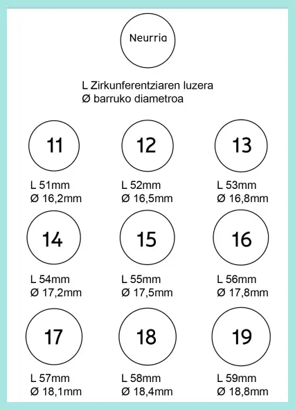 Ondoko irudia beharko duzu zure eraztunaren neurria jakiteko. Kordel edo hari bat erabliz bildu hatzamarra eta boligrafo batekin markatu buelta bat. Neurtu kordel zatia milimetrotan zirkunferentziaren luzera jekiteko (L). Saiatu ahalik eta zehatzen izaten eraztunaren neurrian.